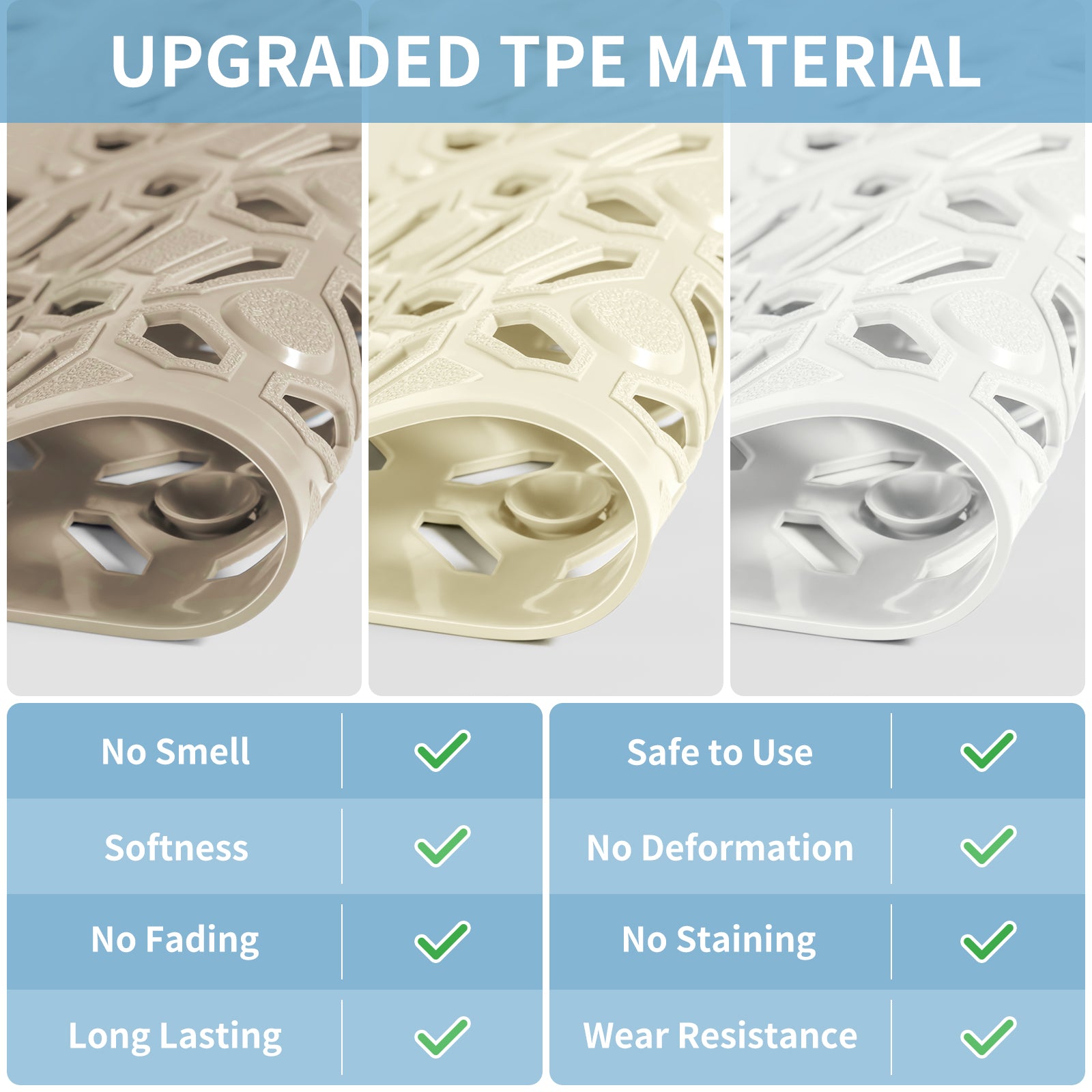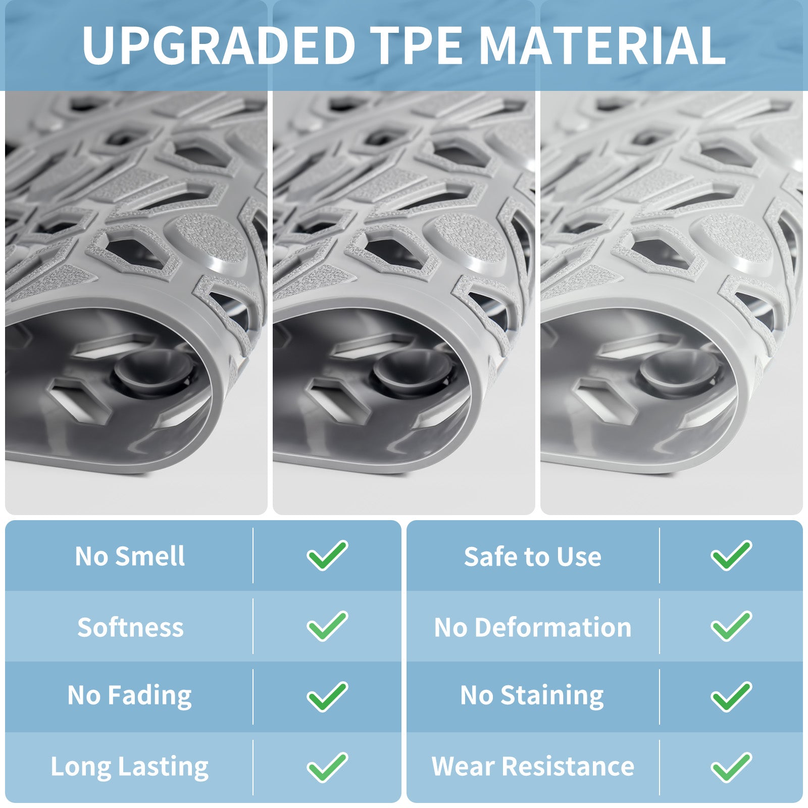- High-Level Choice & Gift Package: No smell TPE material of shower mat non slip provides you with a high level enjoyment of shower. With our specially designed cardboard box, the stand up shower mat will be a practical gift choice