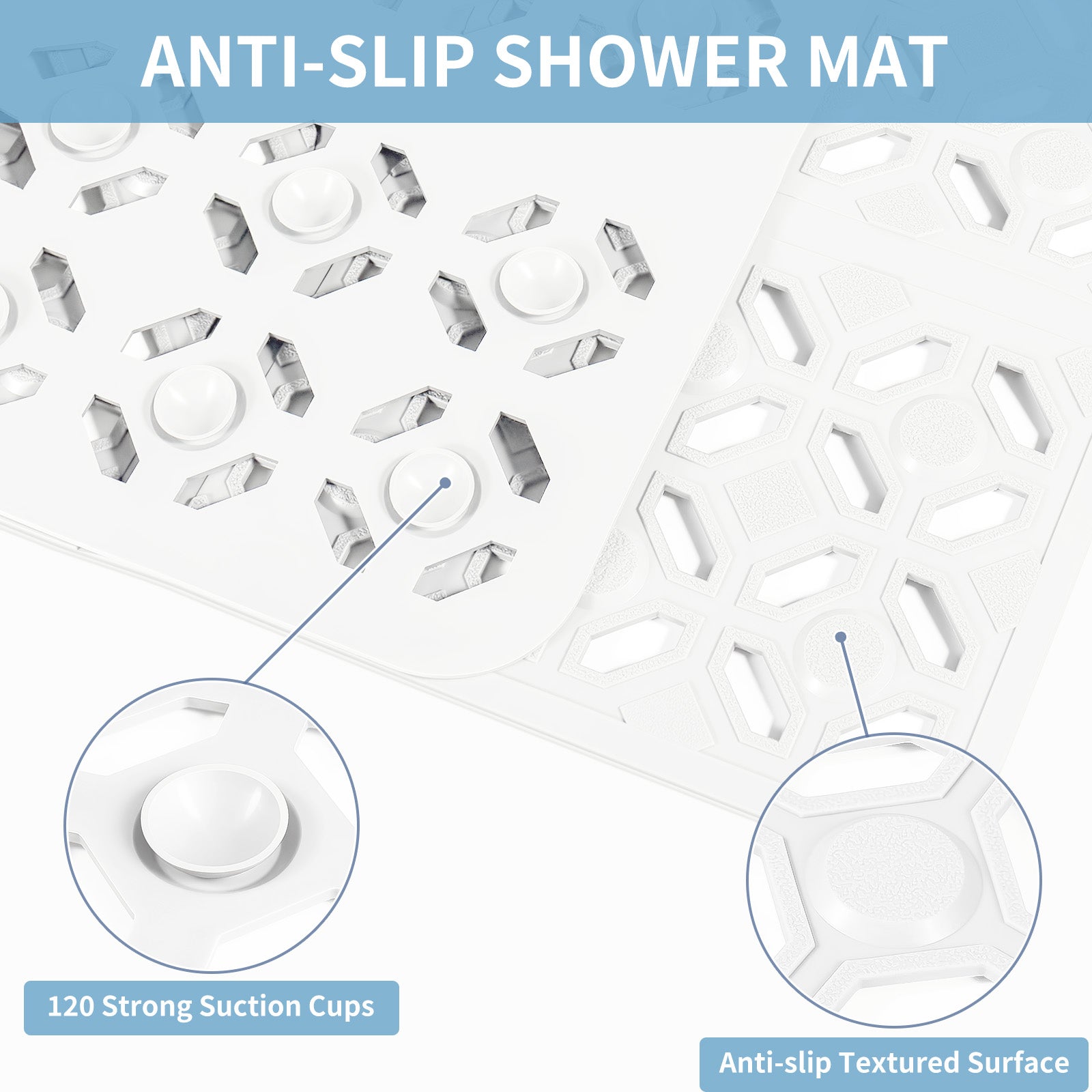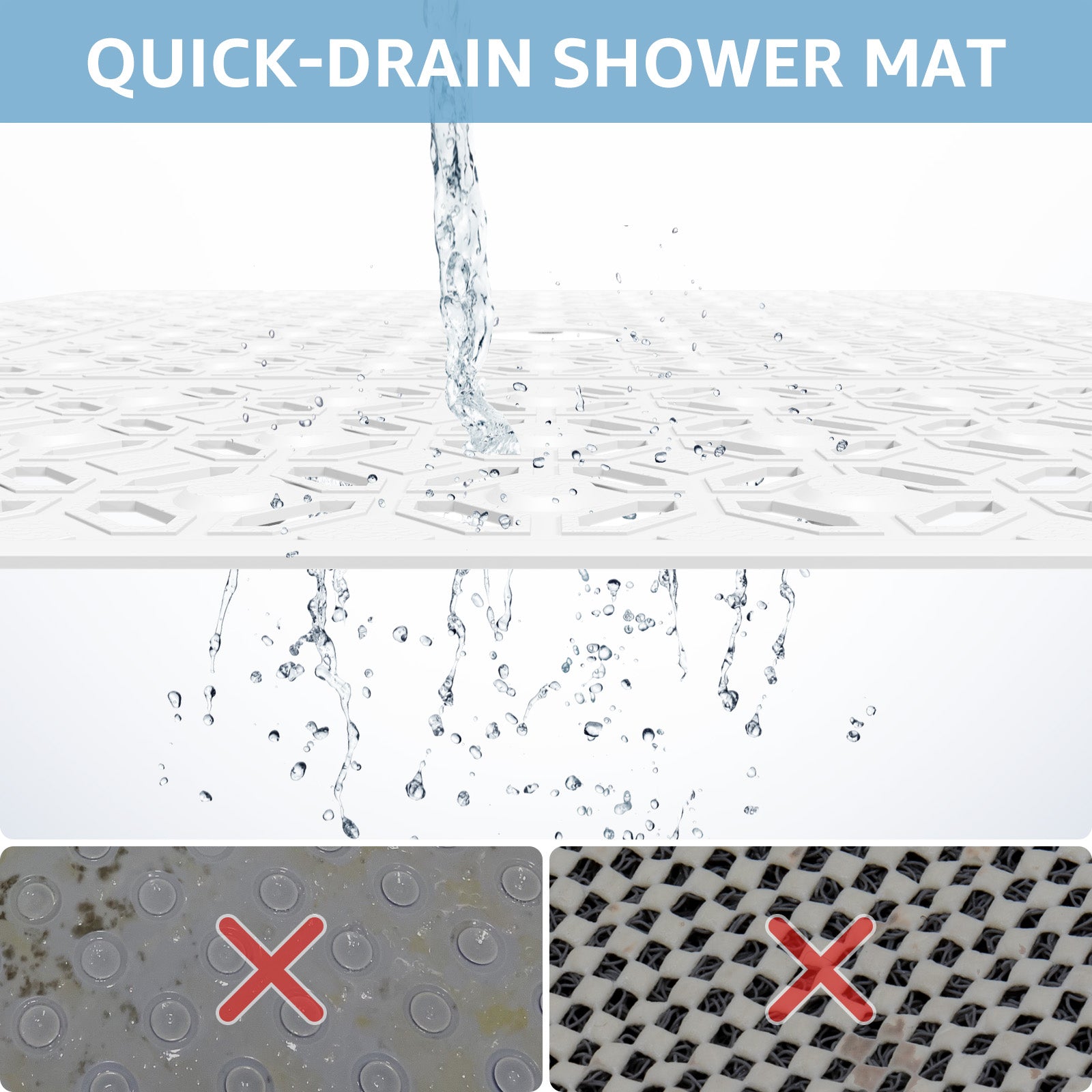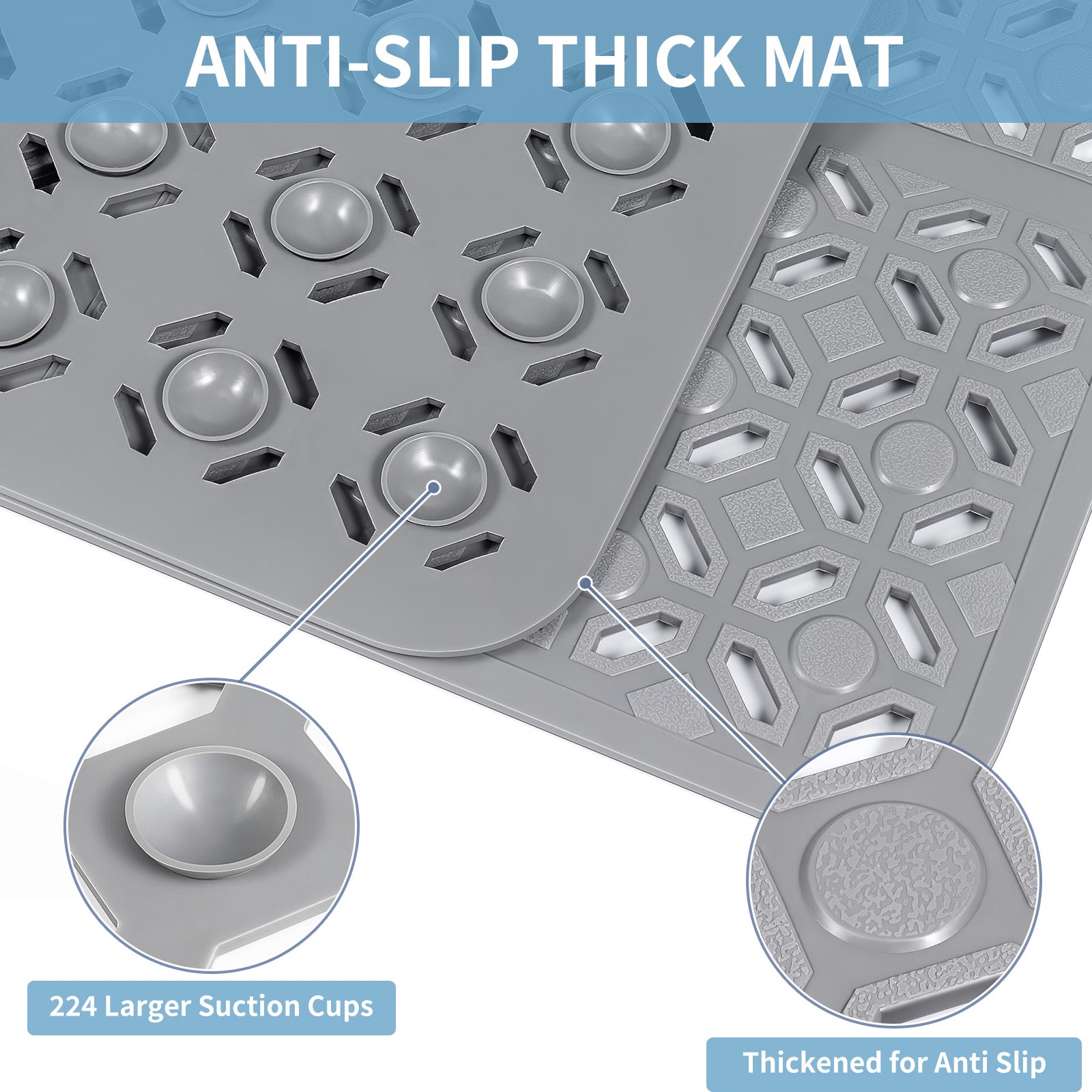 - Non-Slip & Quick Drain: With anti-slip textured surface and 224 strong suction cups, the shower stall mat are suitable for families with elderly and kids. The big hole in the middle and full hollow design makes the shower mat excellent drainage